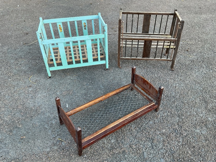 A collection of Dolls and children’s beds & cradles - cots with slatted bases and rise-and-fall slides; a dolls bed with wire mesh base; cradles on rockers, two with play beads; a woven carrier with handles, etc. (9)