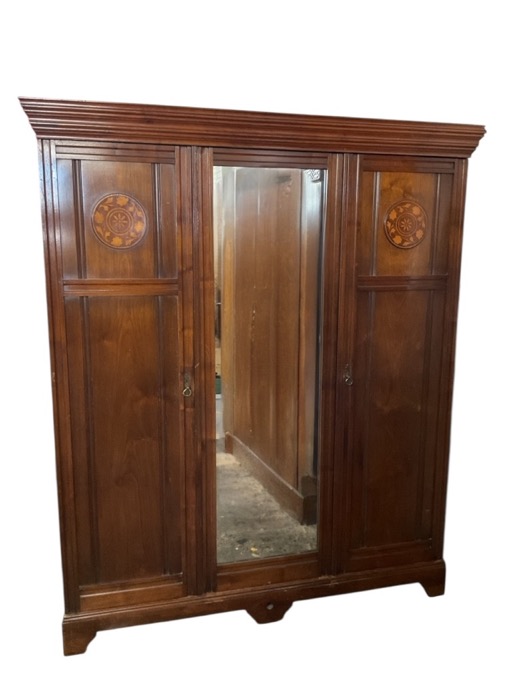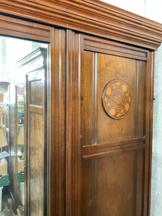 A Victorian walnut wardrobe with moulded cornice above a rectangular mirrored door flanked by brass handled panelled doors mounted with floral marquetry roundels, enclosing fitted interior, raised on bracket feet. (72in x 22.5in x 84in)
