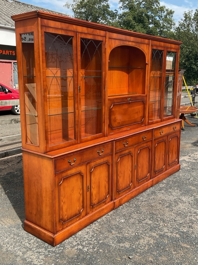 A Georgian style yew cabinet with moulded cornice above an arched open shelf and fall-front cocktail cabinet flanked by glazed display cabinets, on a base with brass handled drawers and doors on a plinth. (106in x 17in x 77in)