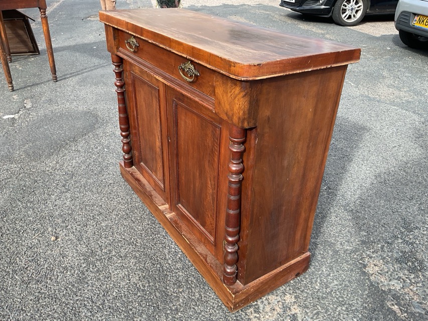 A Victorian mahogany chiffonnier with rectangular rounded top above a brass handled frieze drawer and a pair of panelled cupboards flanked by turned columns, on a plinth. (41.5in x 15.5in x 33in)