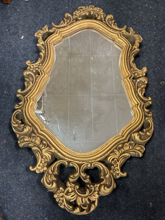 A Georgian style gilded plaster framed mirror with shaped plate bordered by pierced floral scrolling, with conforming scrolled crest. (17in x 28in)