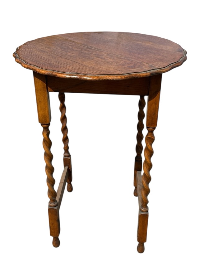 A circular oak scalloped top occasional table supported on barleytwist legs joined by rectangular stretchers. (21.5in x 28.5in)