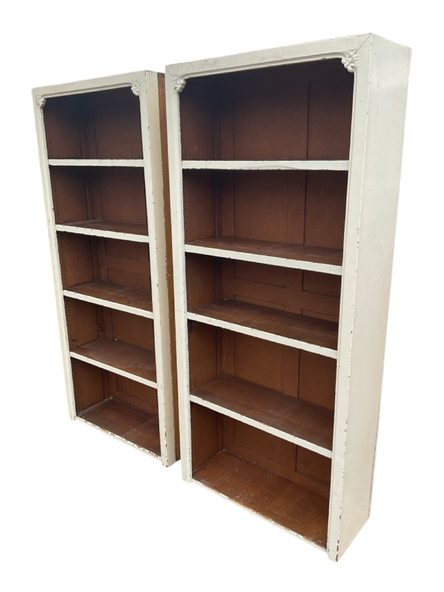 A pair of Victorian painted oak bookshelves with adjustable platforms in moulded frames having carved fleur-de-lils top spandrels. (30.25in x 11.75in x 67.5in) (2)