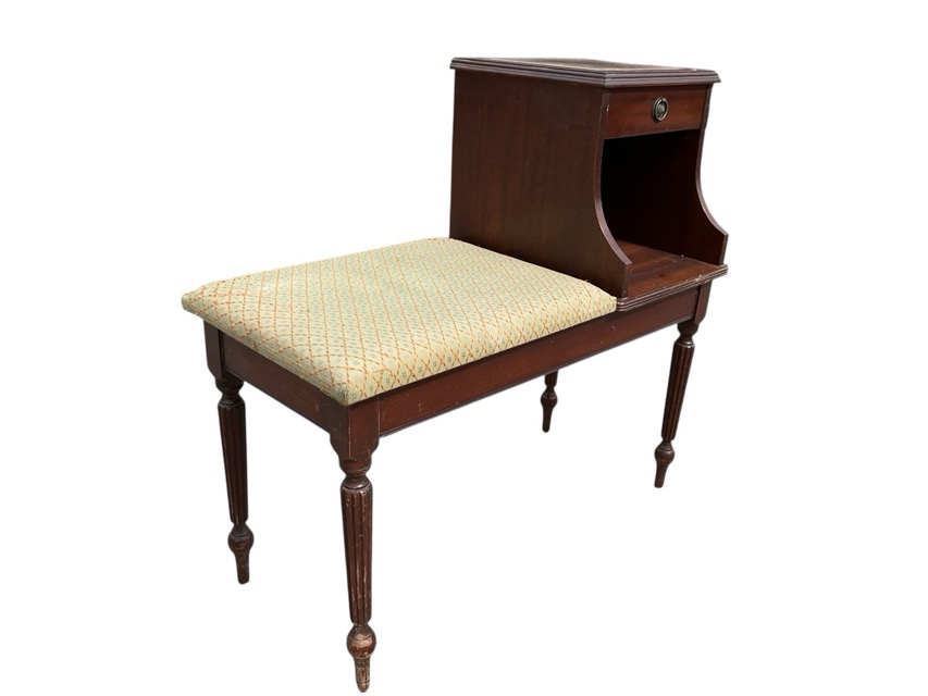 A mahogany telephone table with brass ring handled drawer and open compartment flanked by a rectangular upholstered seat, raised on turned reeded legs. (32in x 15in x 30.5in)