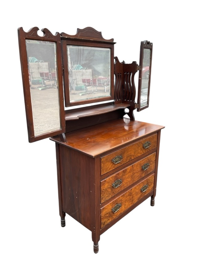 An Edwardian burr walnut mahogany dressing chest with central bevelled mirror tilting between pierced supports with conforming hinged wings, above a platform shelf and three brass handled drawers, raised on turned legs. (32in x 20in x 65.5in)