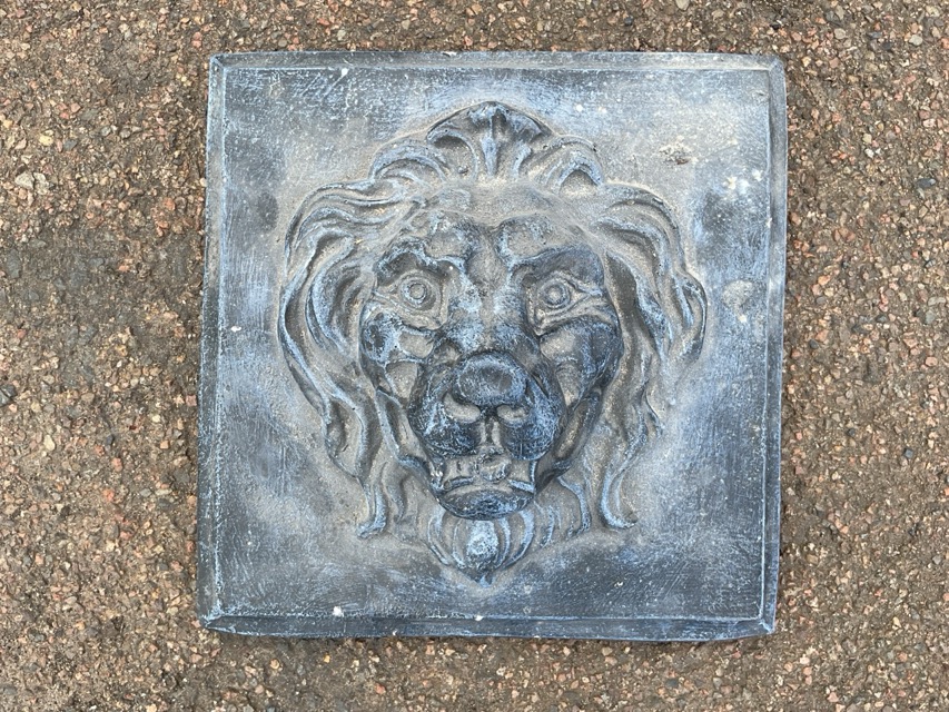 A square faux lead composition plaque cast in high relief with a lions mask. (11.5in x 11.5in)