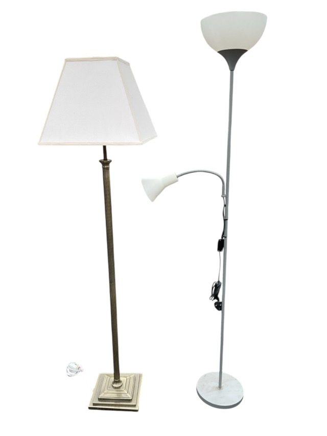 A brass standard lamp with reeded column on a weighted square stepped base with pyramidal shade; and a contemporary uplighter standard lamp with bowl shade on a tubular column having adjustable subsidiary reading light, on a circular weighted base. (2)