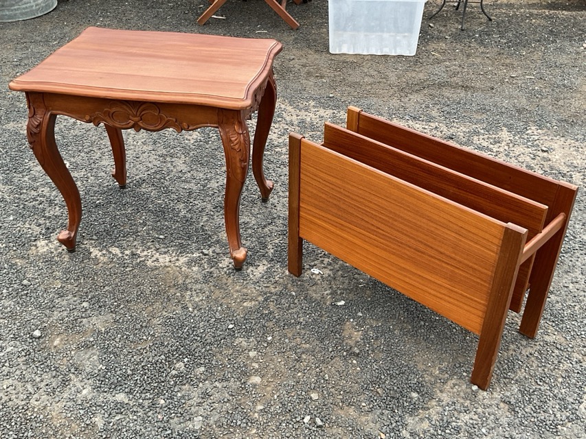 A rectangular mahogany scalloped top coffee table with scroll carved aprons raised on cabriole legs; and a 70s teak magazine rack with two divisions. (2)