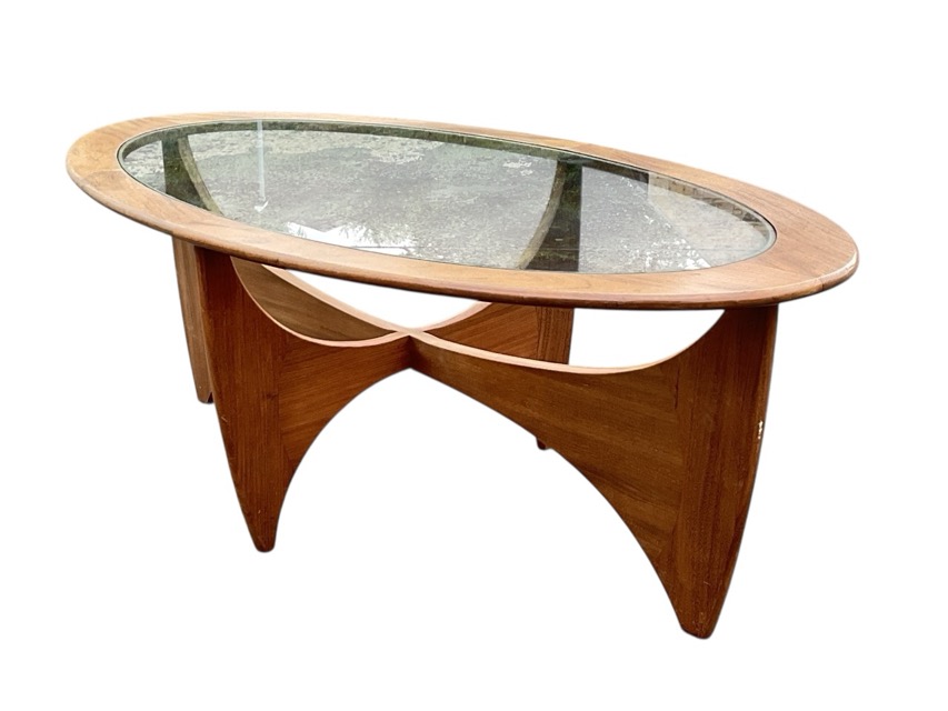 An oval G-plan walnut coffee table with glass panel to top, supported on sail shaped crossed legs. (48in x 25.5in x 16.75in)