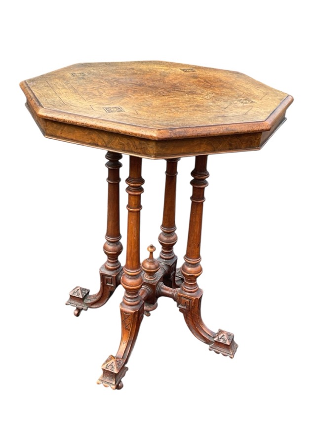 A Victorian burr walnut octagonal occasional table with boxwood & ebony strung top inlaid with geometric tunbridge squares, on turned legs above quadripartite base with outswept supports on ceramic castors. (22.5in x 22.5in x 26in)