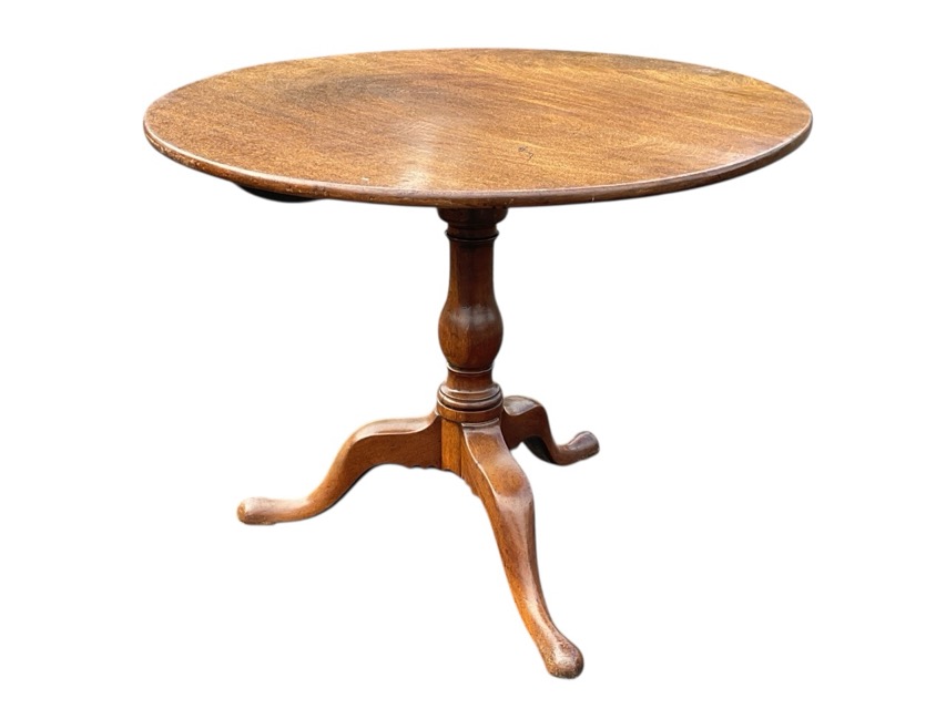 A Georgian mahogany circular tilt-top table with top on a box support and baluster turned column raised on cabriole legs. (36in x 36in x 28in)