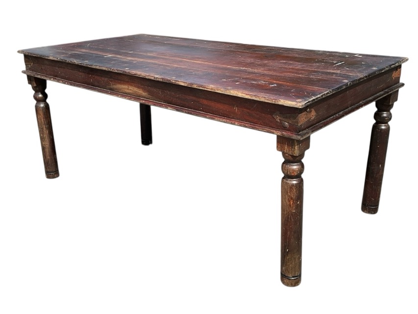 A rectangular hardwood table with metal mounts, having plain apron, raised on canon barrel turned taping legs. (71in x 36in x 30.25in)