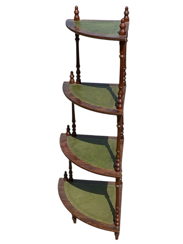 A mahogany corner whatnot with four graduated bowfronted shelves having leather skivers, on turned columns having pawn style finials. (20in x 13.75in x 40in)