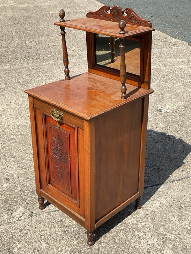 A Victorian walnut fireside cabinet with carved pediment above a shelf supported on turned columns with mirror back, the base with carved hinged compartment having lined interior, raised on turned legs. (14.5in x 14.2in x 34.5in)