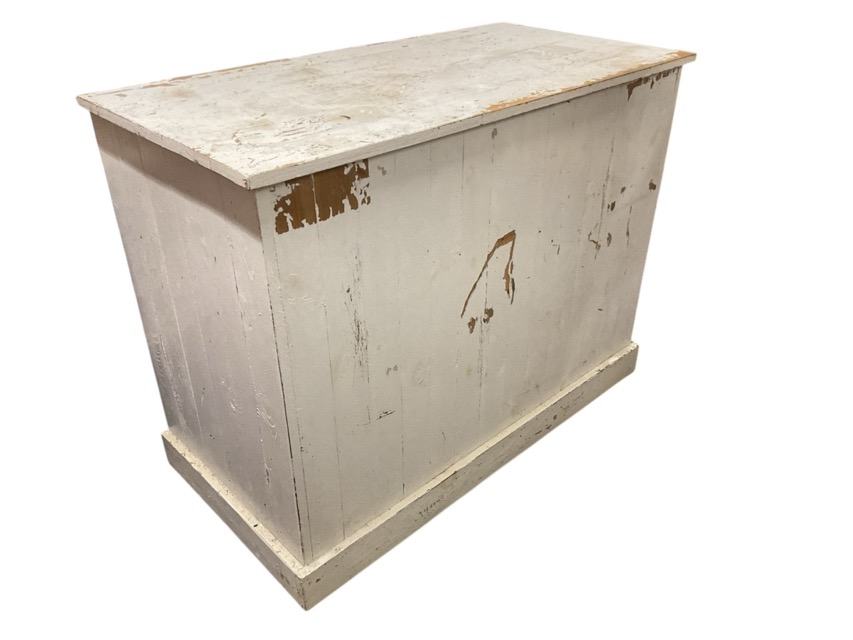 A painted shop counter of boarded construction, the back with open shelves and cash drawer. (46.5in x 23.5in x 35.5in)