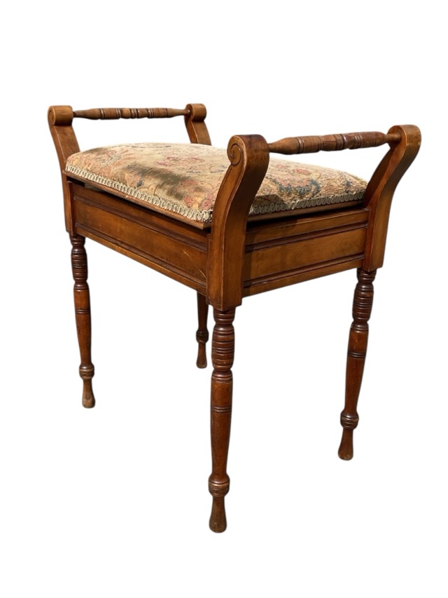 An Edwardian hardwood piano stool with upholstered hinged seat opening to a compartment, flanked by turned arms on scrolled supports, raised on turned legs.
