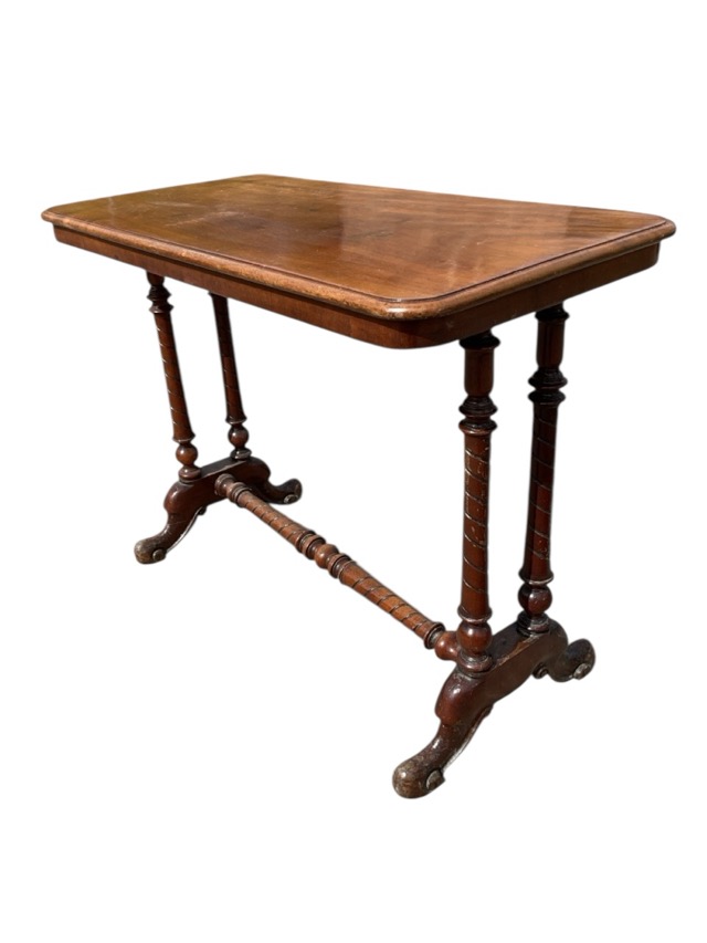 A Victorian mahogany occasional table with rectangular moulded top raised on turned and spiral grooved legs with cabriole feet joined by a conforming stretcher. (32in x 18in x 27.5in)