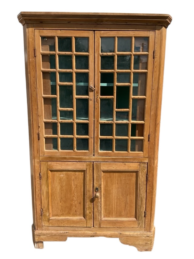 A nineteenth century pine corner cupboard with moulded cornice above astragal glazed doors enclosing a painted interior with shaped shelves, above a panelled door cupboard, raised on bracket feet. (44in x 21in x 79.5in)