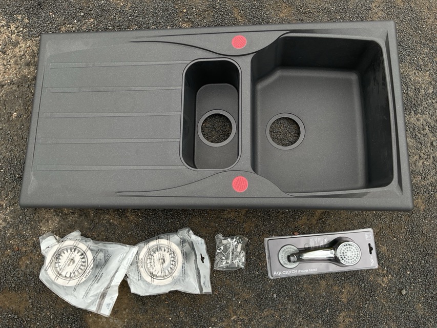 A boxed new and unused graphite sink with large and small bowls, grooved draining board and chromed plugholes; and a cased Aquaspray shower head. (38in x 20in) (2)