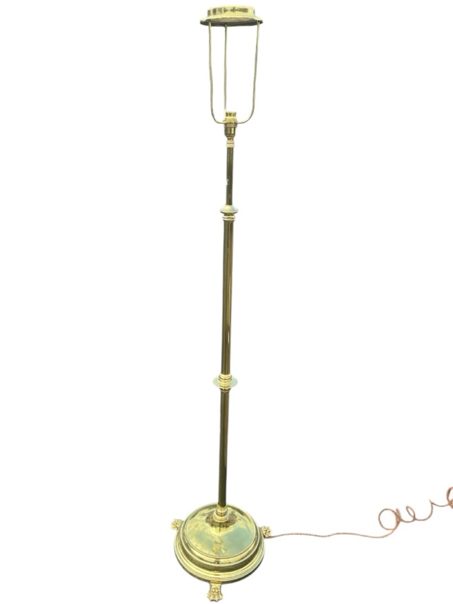 An Edwardian style brass standard lamp with knopped column on a circular weighted domed moulded base, raised on lions paw feet, with waisted fabric shade. (66in)
