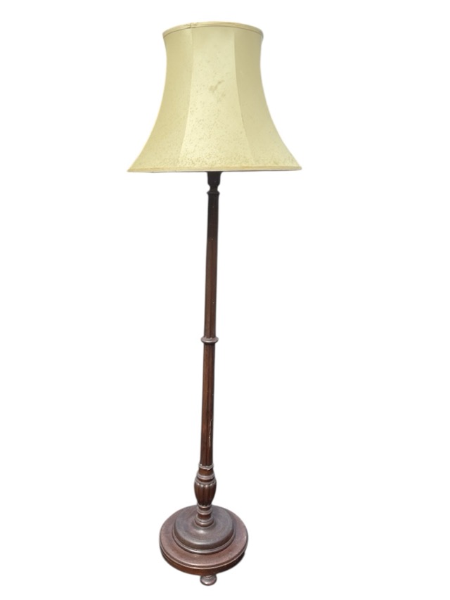 A mahogany standard lamp with turned fluted column on a moulded circular base, raised on bun feet, with flared silk shade. (73in)