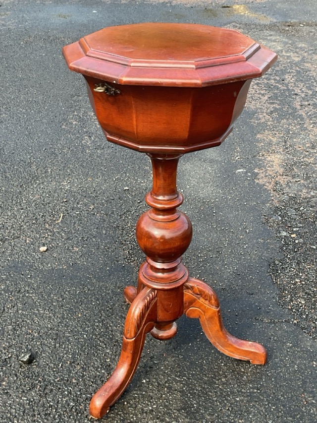 A Victorian style mahogany sewing table with decagonal moulded top inlaid with scrolling foliage enclosing a lined interior with mirror to lid, on a turned column above tripod base with acanthus carved legs. (16in x 16in x 30in)