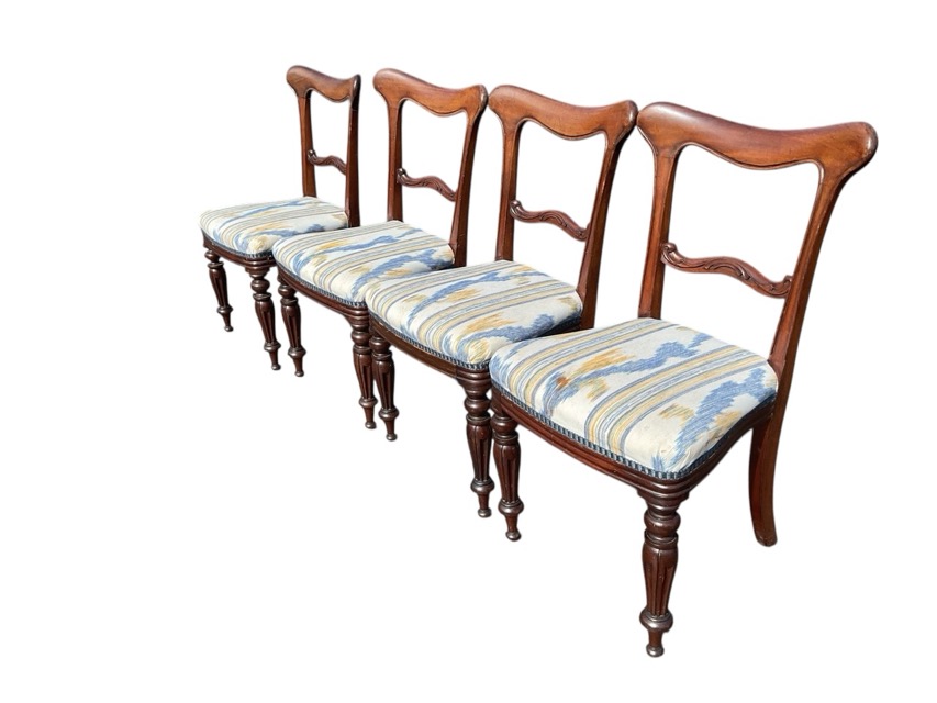A set of four Scottish regency mahogany dining chairs, the fluted crescent shaped backs beneath ribbed tablet rails inlaid with boxwood & ebony stringing, the drop-in upholstered seats raised on sabre legs. (4)