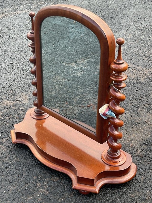A Victorian mahogany dressing table mirror with arched plate tilting between barleytwist supports with turned pointed finials, on a serpentine shaped base raised on bun feet. (23in x 10in x 23in)