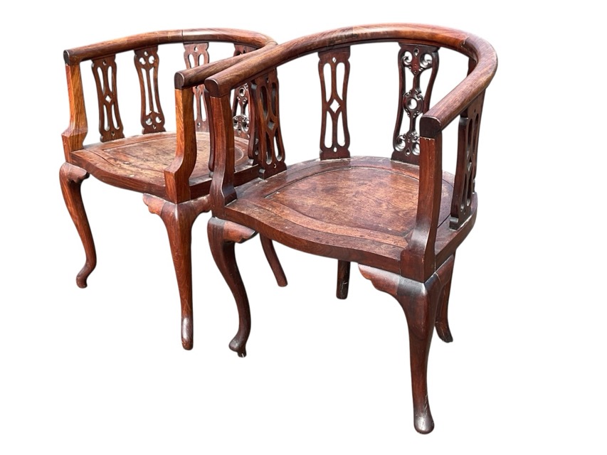 A pair of shaped rosewood captains style armchairs with horseshoe shaped arms above pierced carved splats and drop-in panelled seats raised on cabriole legs. (2)