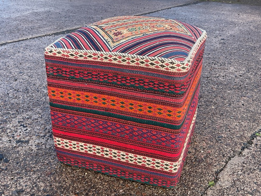 A square pouffe upholstered in Moroccan kilims woven with geometric motifs. (18in x 18in x 19in)