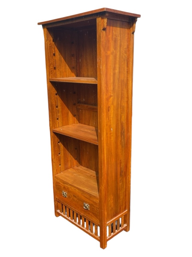 An arts and crafts Mission style hardwood open bookcase with three adjustable shelves and brass handled drawer above a slatted apron, raised on square feet. (29in x 13.75in x 67in)