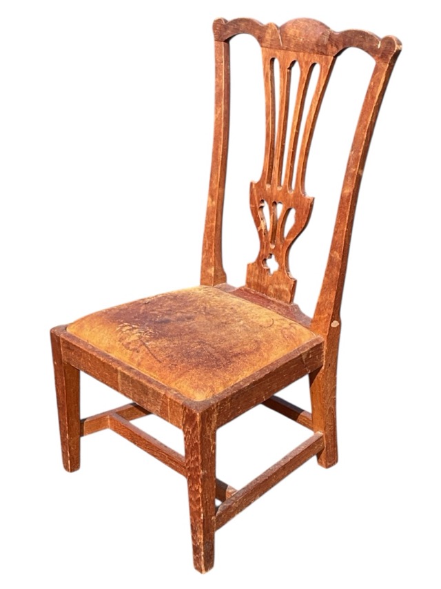 A Chippendale style elm gossip chair by Wheeler of Arncroach, with shaped back rail above a pierced splat, the leather drop-in upholstered seat raised on square tapering chamfered legs.