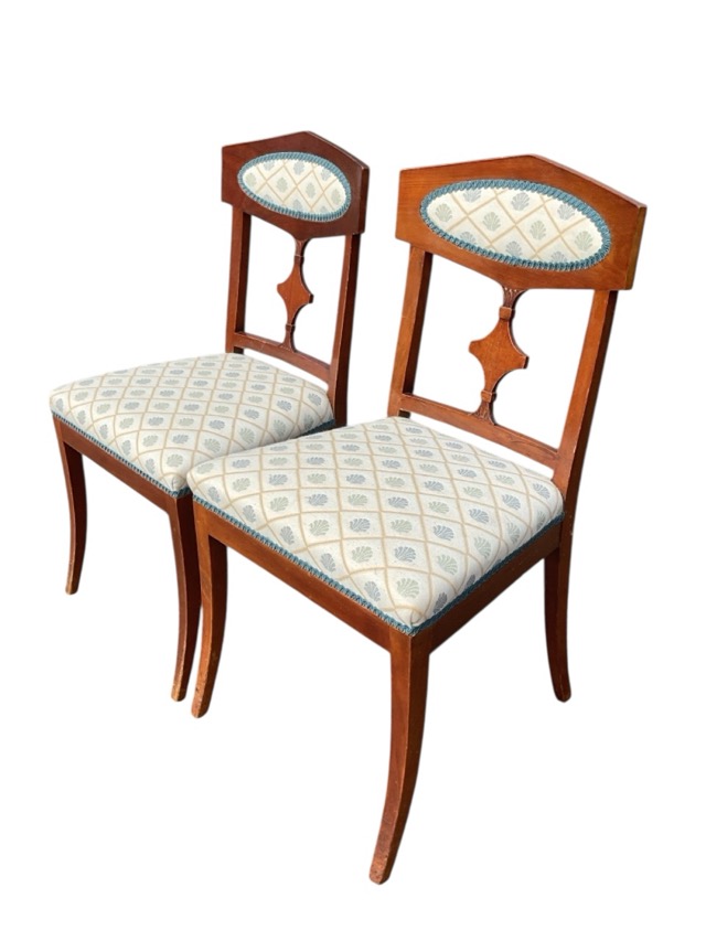 A pair of Biedermeier mahogany chairs with hexagonal padded backs and leaf carved shaped splats above upholstered seats, raised on sabre legs. (2)