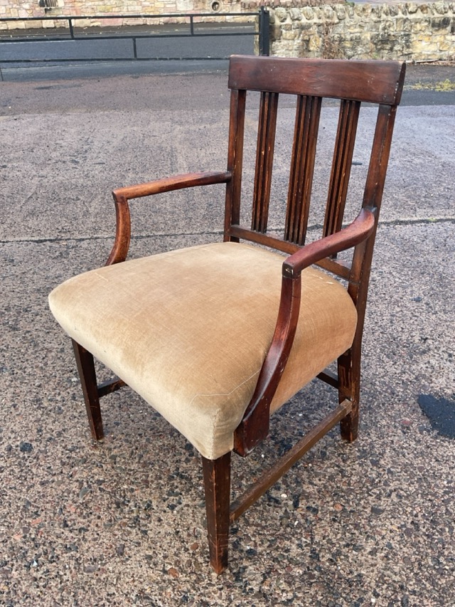 A Georgian mahogany armchair with tablet back and three slatted splats above a flared rectangular upholstered seat, flanked by curved arms, raised on tapering square legs joined by stretchers.