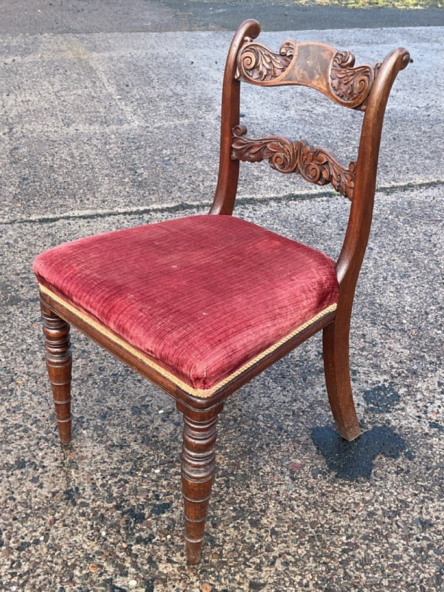 A regency mahogany chair with acanthus scroll carved back and rail above an upholstered seat, raised on turned legs.