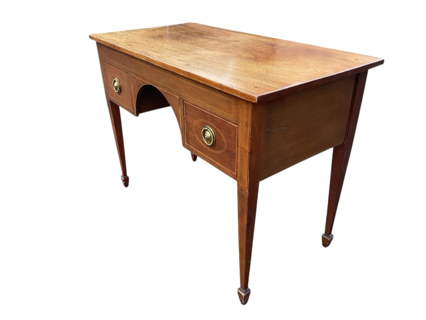 An Edwardian boxwood strung mahogany dressing table with rectangular top above a plain frieze and central arched kneehole flanked by brass ring handled drawers, raised on tapering square legs with spade toes. (41in x 21in x 30in)