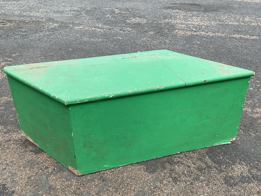 A painted pine rhomboid box with hinged lid enclosing compartment. (47in x 17in x 16.5in)