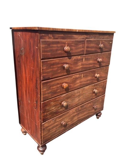 A Victorian mahogany chest of two short and five long knobbed drawers, raised on bun feet. (46.25in x 20in x 52in)