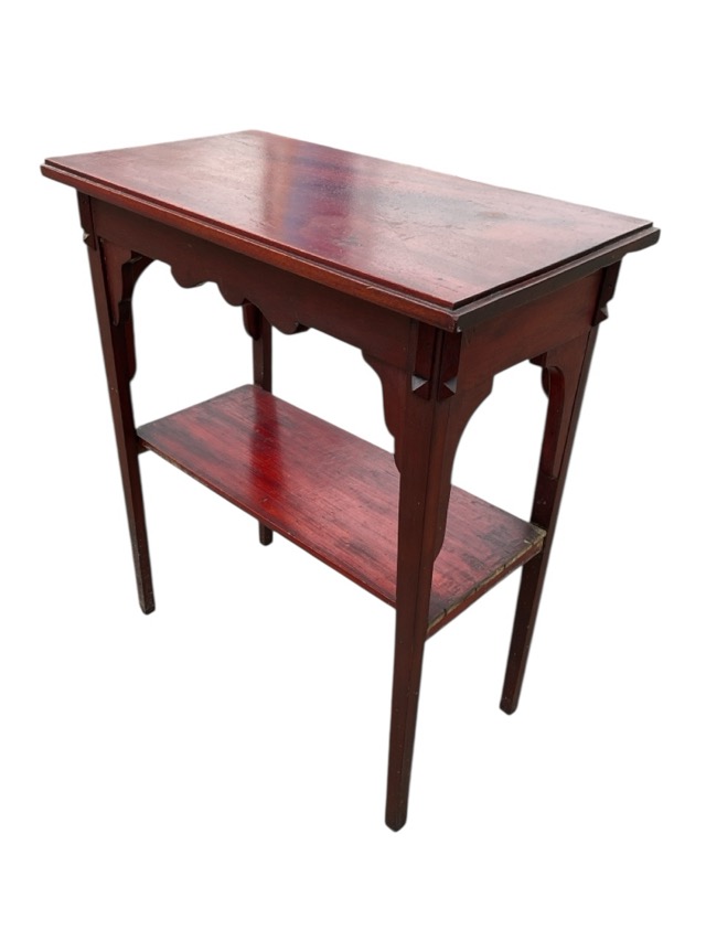 A mahogany side table with moulded rectangular top above shaped aprons raised on square tapering legs joined by platform stretcher. (24in x 12.75in x 27.5in)