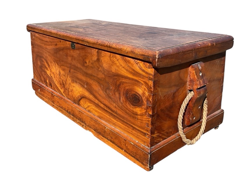 A hardwood seamans trunk with rectangular top above a tapering dovetailed box with rope handles on a plinth. (39.5in x 17in x 16.5in)