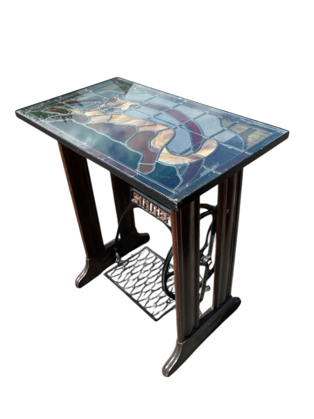A rectangular side table formed from an old Singer sewing machine stand with treadle, the top with a commissioned stained leaded glass panel by Paul Wrightson depicting a cat, in frame. (26.5in x 15.5in x 29.75in)