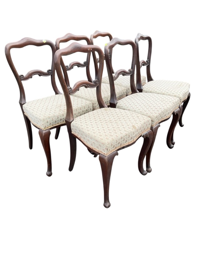 A set of six Victorian rosewood balloon back dining chairs with scroll carved rails above upholstered seats, raised on cabriole legs. (6)
