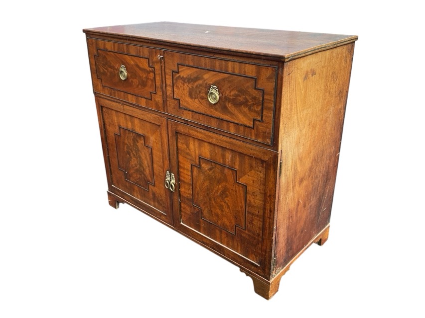 A Georgian ebony strung mahogany secretaire with a fall-front drawer enclosing a gilt tooled leather skiver and satinwood drawers and pigeonholes, above a pair of doors enclosing shelves, raised on bracket feet. (46.26in x 22in x 41in)
