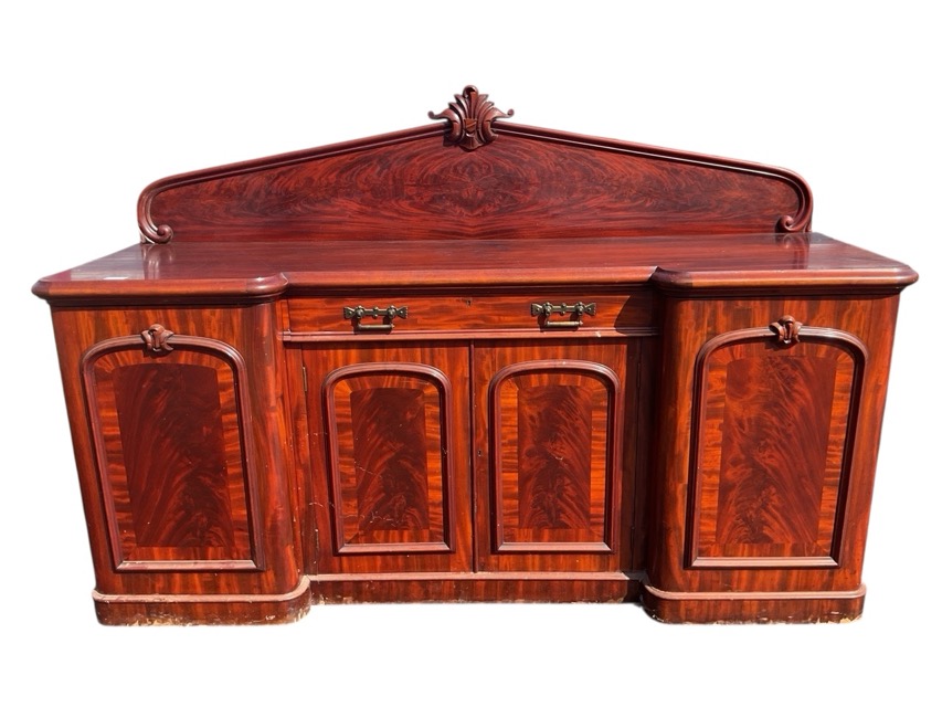 A Victorian mahogany sideboard having raised back with acanthus finial above a breakfront top with central frieze drawer and a pair of arched crossbanded panelled doors, flanked by two conforming doors, raised on a moulded plinth. (80in x 24in x 53.5in)