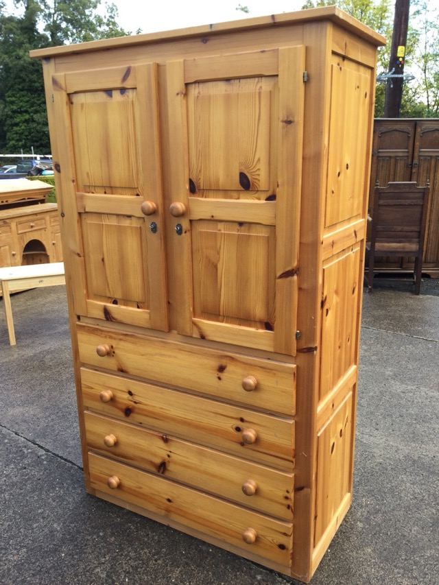 A reproduction pine press cupboard, the top with fielded panelled chamfered doors above four long knobbed drawers. (44in x 21.25in x 72in)
