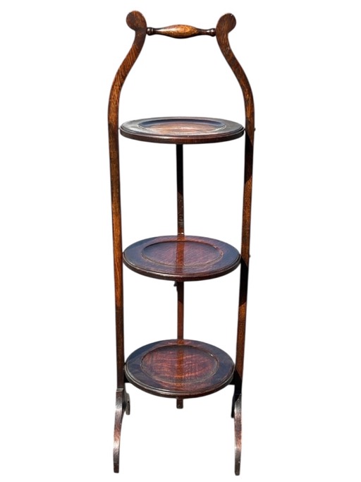 A folding Edwardian oak cakestand with three circular saucer shaped platforms on square supports beneath a turned handle. (35.5in)