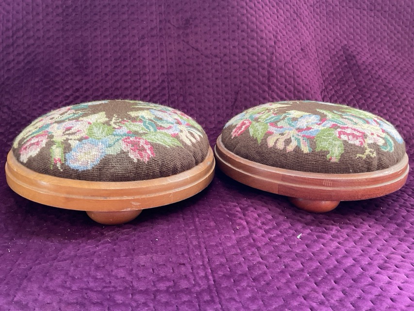 A pair of mahogany footstools with floral needlework domed covers to cushions in circular frames raised on bun feet. (9.75in) (2)