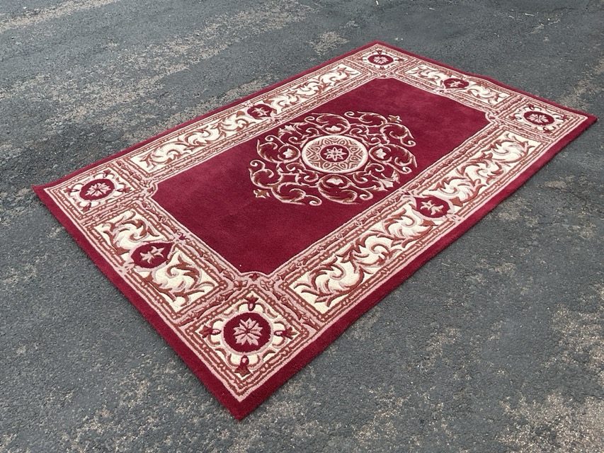 A neoclassical style wool carpet woven with circular medallion amid scrolling on a claret field, within broad formal foliate scrolled borders having flowerhead corners. (61in x 96in)