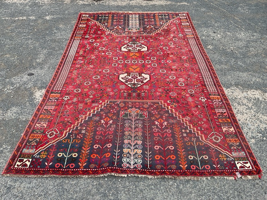 A Shiraz wool carpet woven with a dense symmetrical pattern of flowerheads on a red field, flanked by stepped pyramidal panels of tall flower stems within geometric and zigzag borders. (70.5in x 109in)