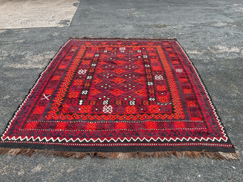 An Afghan Maimana wool kilim carpet woven with two rows of geometric lozenge motifs on a red field, within multiple stylised flowerhead and geometric borders. (88.5in x 120in)